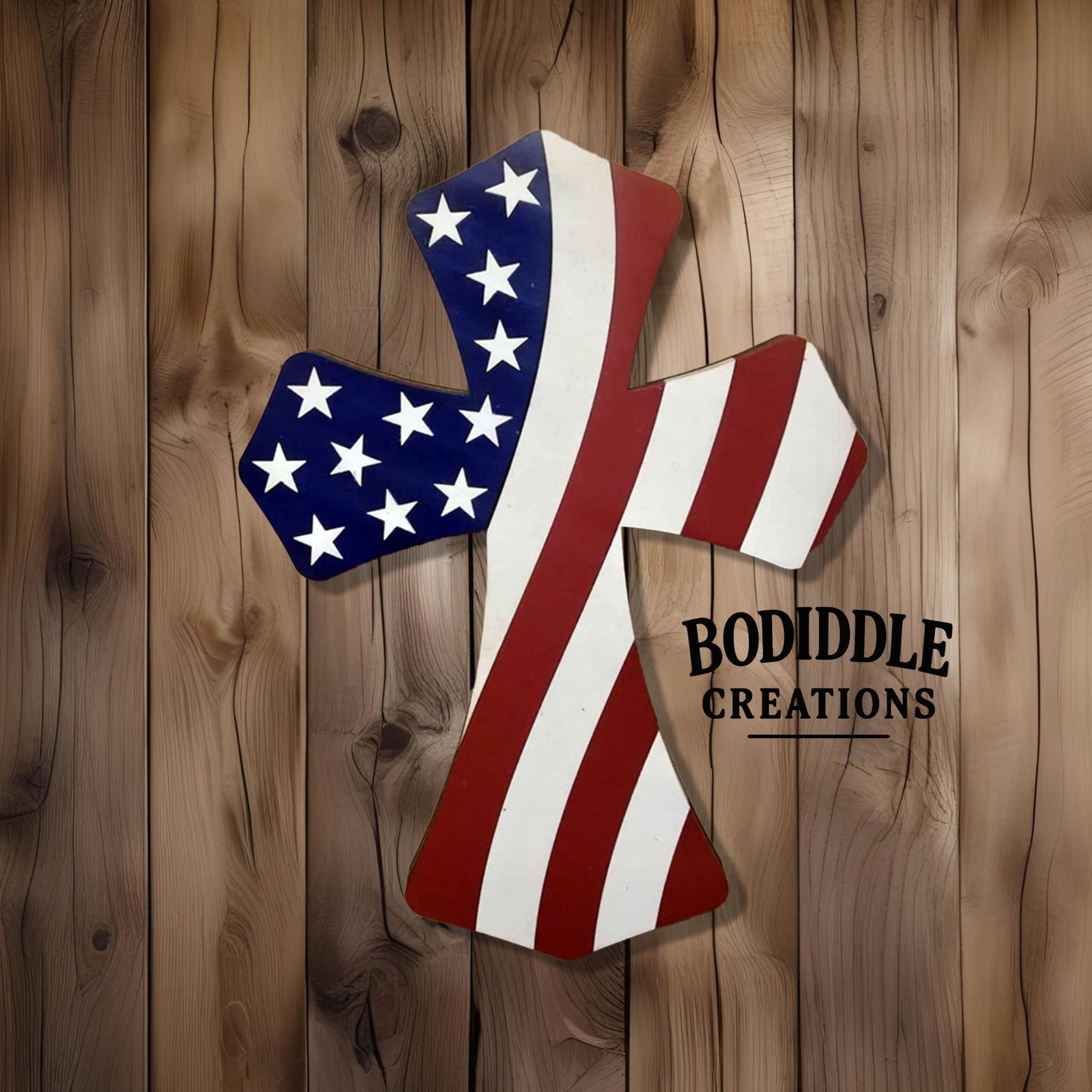 Celebrate your faith and patriotism with this beautifully crafted wooden American Flag Cross. Precision laser cut from high-quality wood, this cross features a unique design that merges the timeless symbol of the cross with the iconic stars and stripes of the American flag.